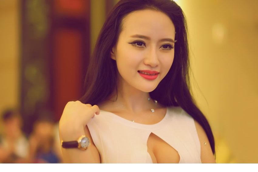 吴雨蝉回眸浅笑,黑色开胸装与飘逸长发相映成趣